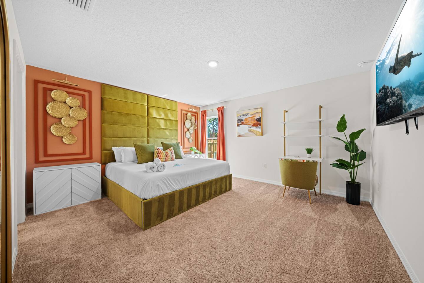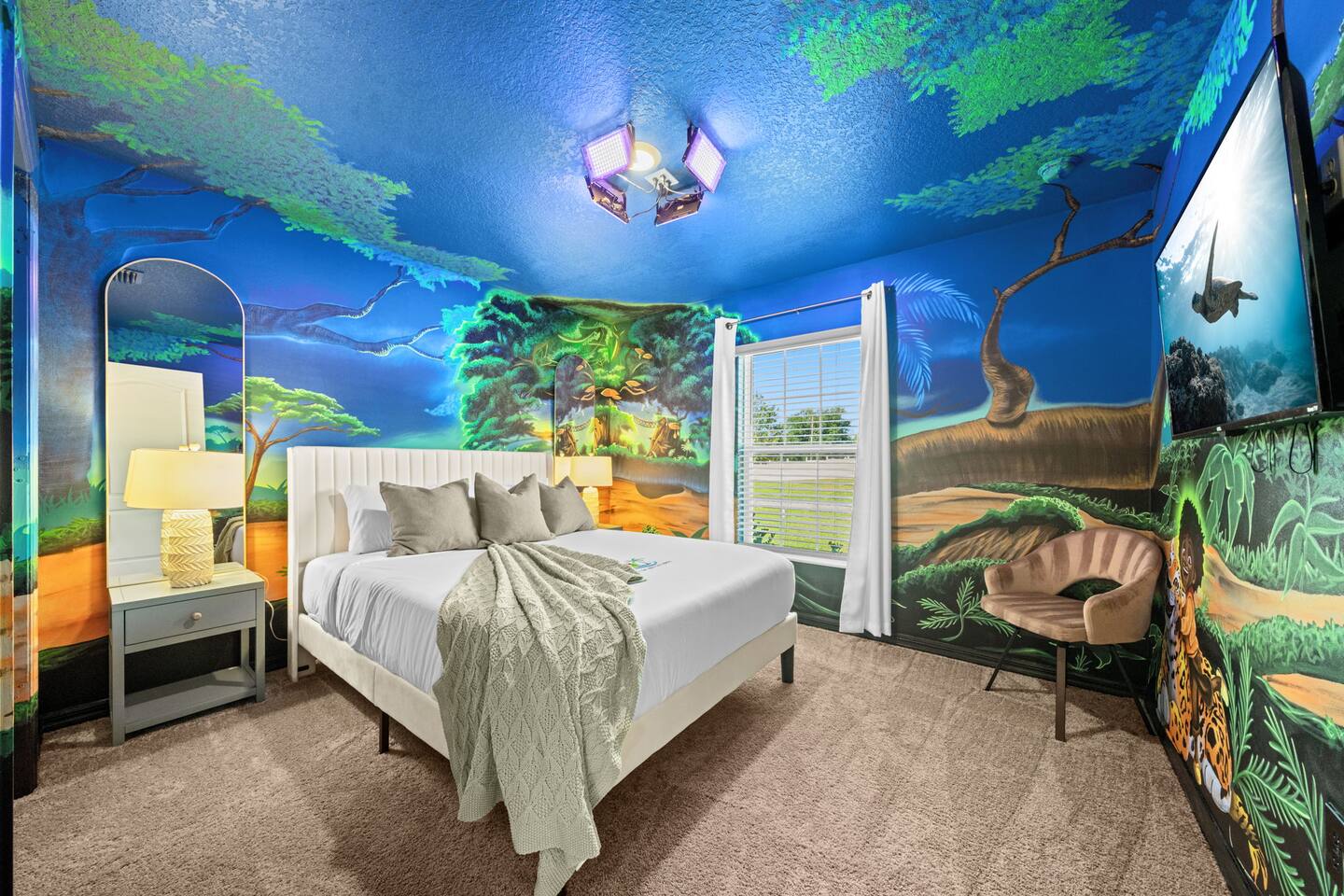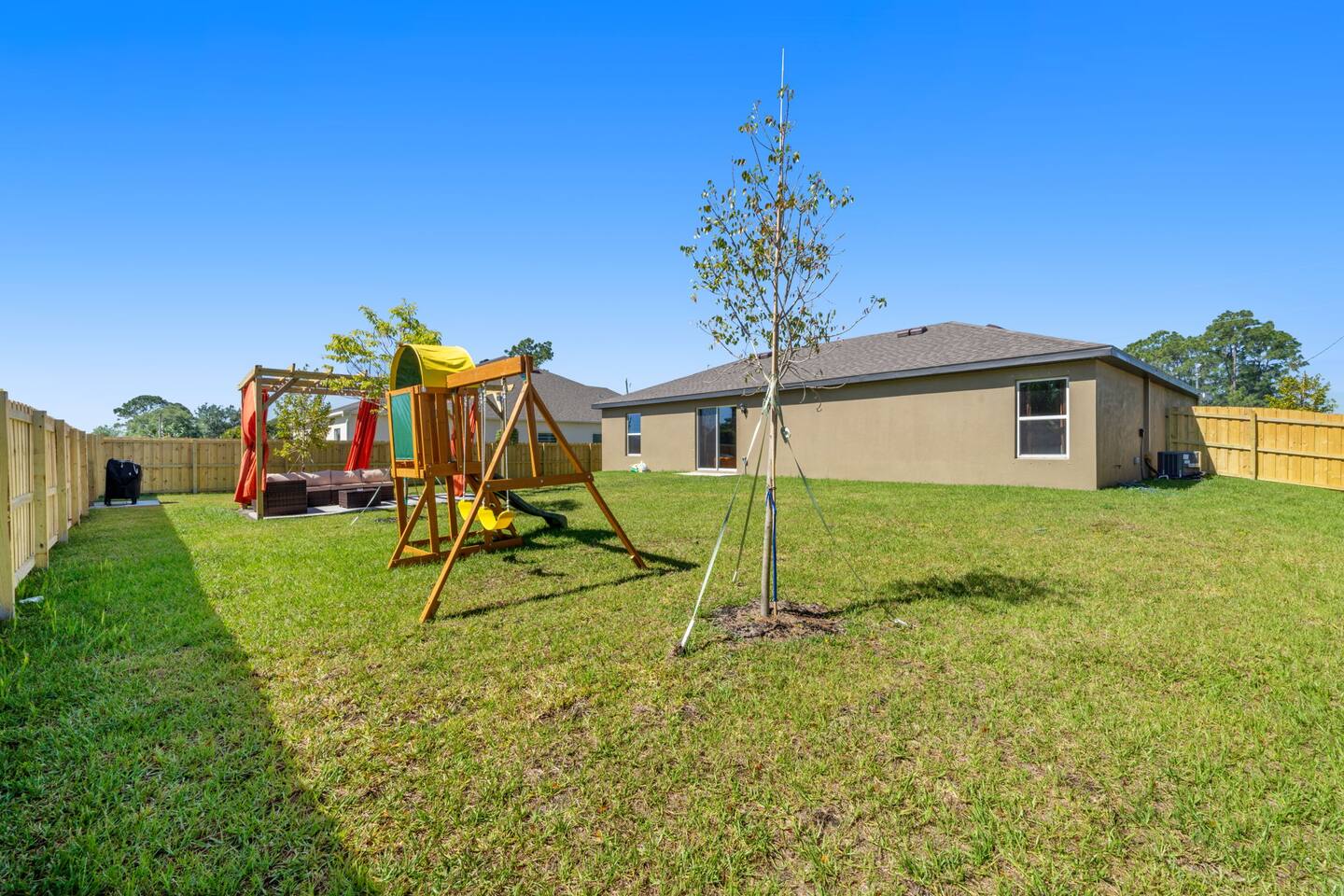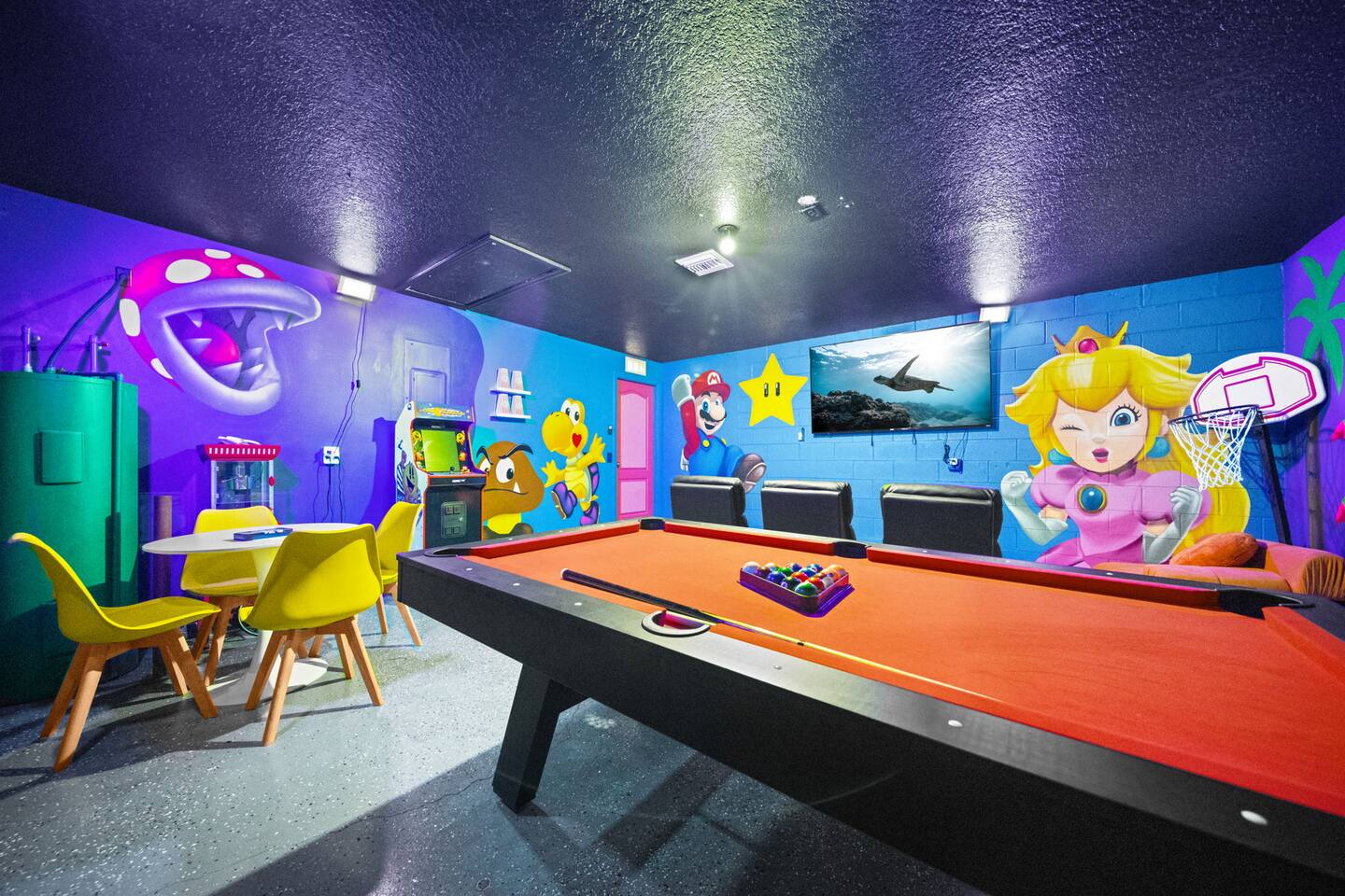 🌟 Welcome to the Encanta Magical! 🌟 🏡 This beautiful single-family home built in 2023 offers a spacious retreat with 3 bedrooms and 2 bathrooms, providing ample space for up to 6 guests. The game room will feature a pool table and a popcorn machine for endless entertainment. 🛏️ Bedrooms: • Three Bedrooms within two theme room • Master suite featuring a sizable walk-in closet • One king bed • Two queen beds • Comfortable sleeping arrangements for a restful stay 💤 🛁 Bathrooms: • Two full bathrooms • Primary bathroom with shower • Plentiful storage space and modern fixtures 🍽️ Kitchen: • All new energy-efficient Whirlpool® appliances • Spacious countertops for meal preparation • Stunning wood cabinets for ample storage • Kitchen island for additional workspace and seating 🌳 Outdoor Amenities: • Driveway parking - Vehicles up to 4 can park easily • Front yard landscaping • Patio and porch for outdoor enjoyment • Storm shutters for added security during inclement weather 📍 Location: • Premier location in Palm Bay with convenient access to nearby golf courses • World-class area beaches just a short drive away • Amenity-packed parks for outdoor recreation Don't miss out on experiencing the Caladesi lifestyle! Book your stay now for a memorable getaway. 🌴