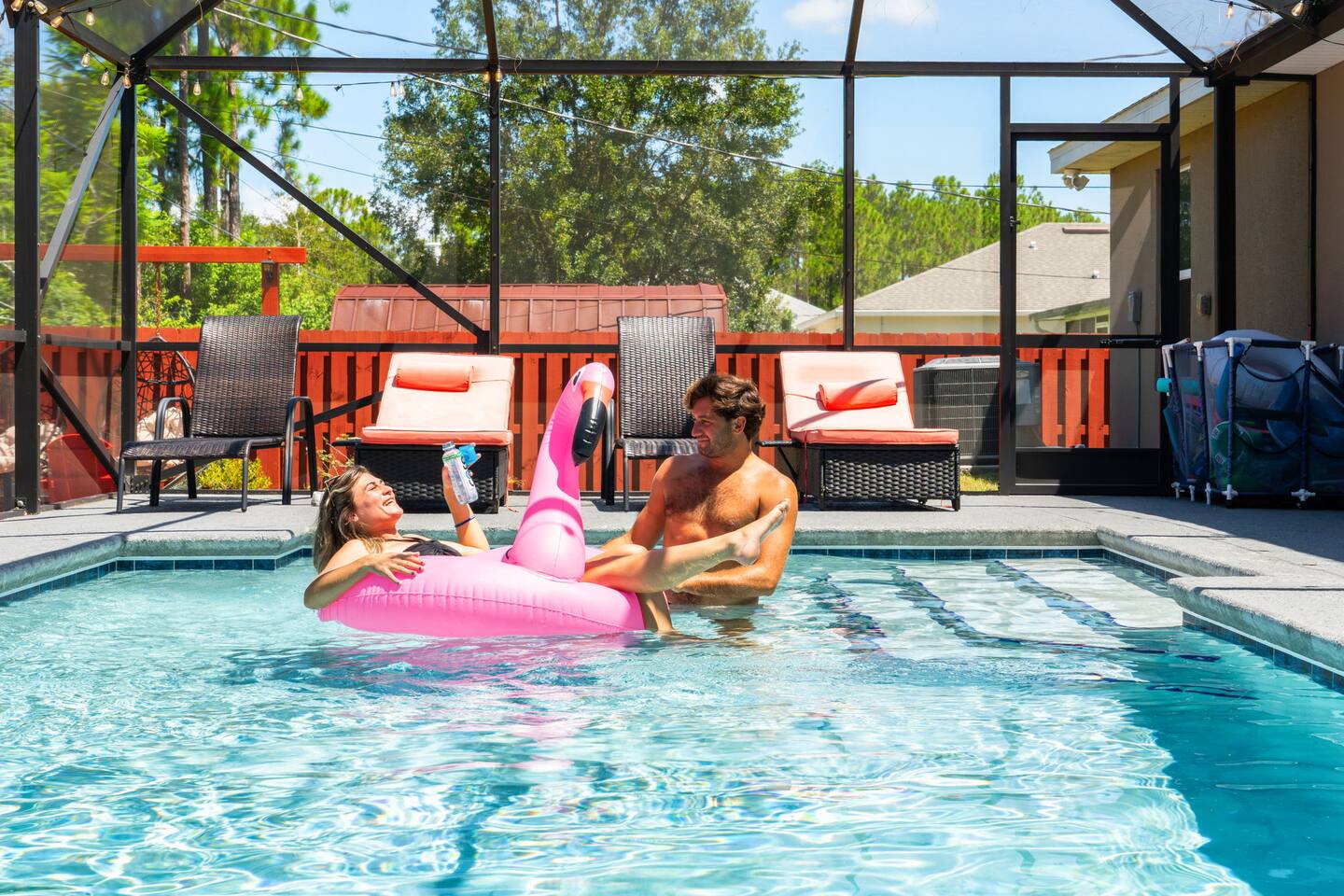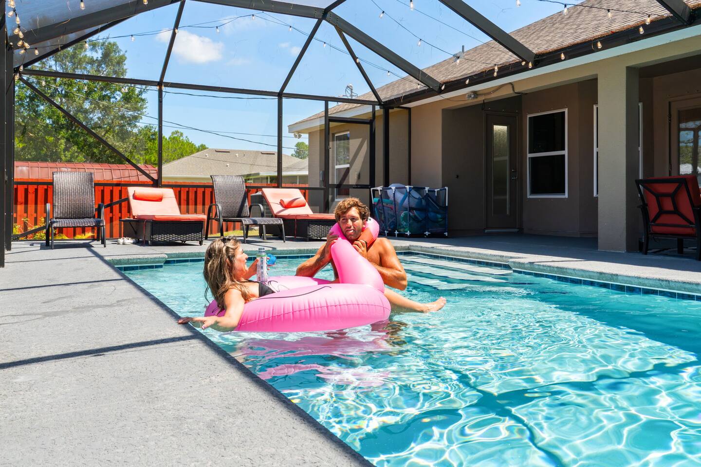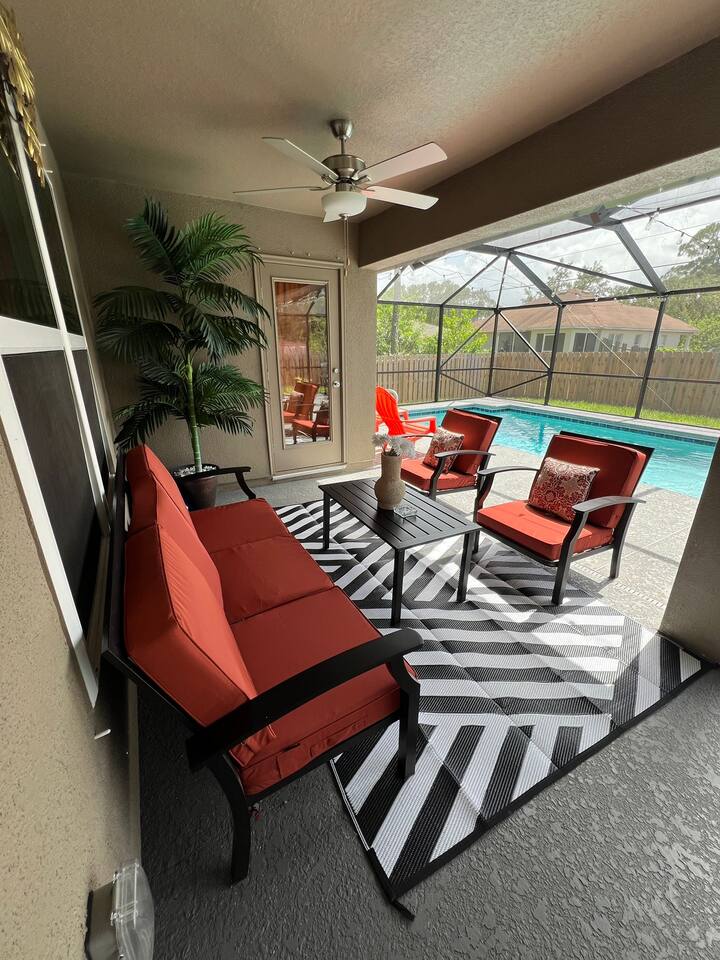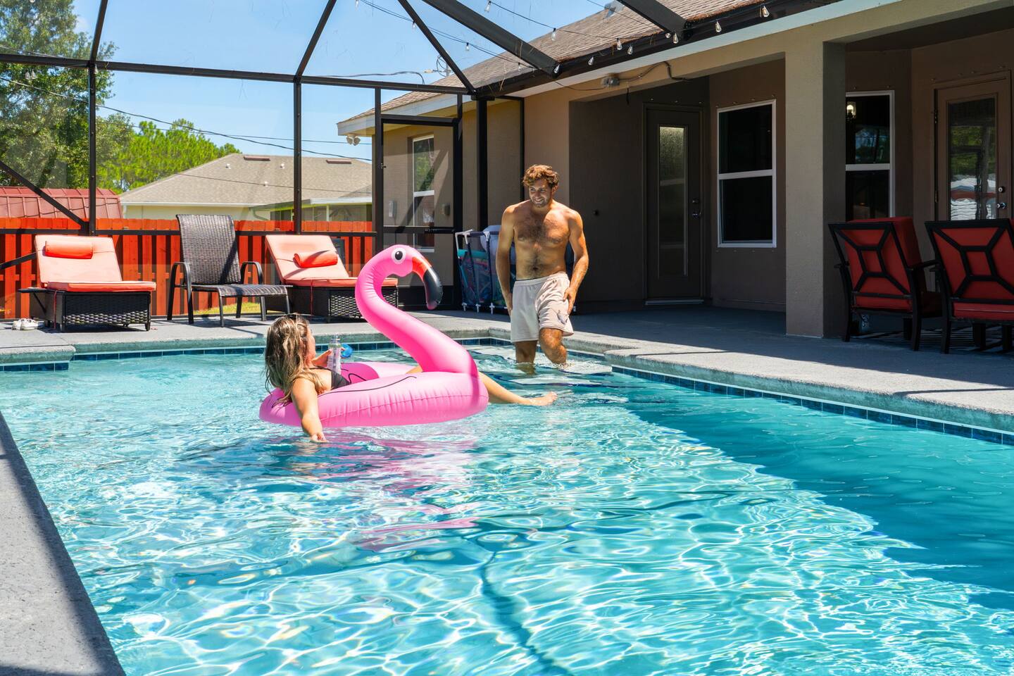 Our home features a beautifully designed interior with a spacious living area that includes a cozy sofa set and a large TV, ideal for relaxing evenings. The house is air-conditioned and has ceiling fans to ensure your comfort in Florida's warm climate. The dedicated workspace with Wi-Fi access provides a quiet corner for those needing to stay connected. The kitchen, a chef's delight, is fully equipped with cooking basics, a variety of appliances including a dishwasher, microwave, oven, and a coffee maker, ensuring you have everything you need for a home-cooked meal. The dining area, adjacent to the kitchen, features a large dining table perfect for family dinners. Our bedrooms are thoughtfully designed, providing a peaceful retreat after a day of exploration. The beds are comfortable, complete with high-quality linens. Bathrooms are stocked with essentials like shampoo, conditioner, and body soap, adding to your convenience. 🌟 Enhance Your Stay with Pool Heating! 🏊♂️🌡️ Dive into ultimate relaxation by opting for our pool heating service! Our pool is designed to reach a comfortable 86°F, providing a blissful experience. For a nominal fee of $40 per night, you can enjoy the warmth throughout your stay. ***A heated pool does not feel like Jacuzzi Hot Tub. It feels refreshingly and comfortable. To ensure your perfect swim, please notify us at least 24 hours before your stay, allowing ample time for the pool to reach its ideal temperature. Make your getaway even more delightful with our inviting heated pool experience! 🔥